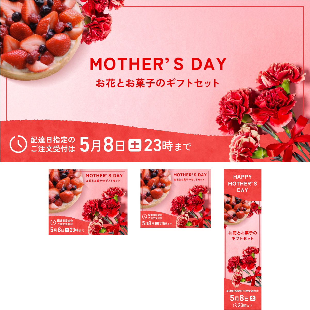 赤系で統一し、お菓子も含めた写真を大きく打ち出すことで、母の日のギフト提案として目につくようにしています。